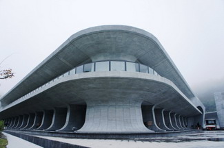 日月潭向山行政暨遊客中心,是由日本株式會社團紀彥建築設計事務所設計。基地剛好面對涵碧樓,樓高二層,避免過於凸出於山林之中,比較是平面性的配置,以不影響周遭整體環境為目標,相較水社碼頭上的超高建築,真是強烈的對比。建築上用了不少曲線,也用了著名清水模、無邊界水池來增加與日月潭的連結及呼應。