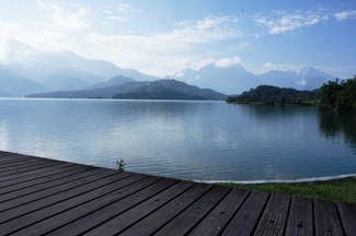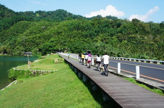 水社親水步道是連接水社碼頭至九龍口重要的人行動線,起點為水社碼頭,終點為九龍口竹石園,全程皆為無障礙斜坡道,十分平緩易行;並有高架木棧道創造出臨水賞景的最佳位置。沿途使用現地砂岩堆砌出具有當地意象的石牆圍塑出休憩點,遊客可在憑欄遠眺之際,藉由解說系統獲得旅遊資訊以及生態知識。