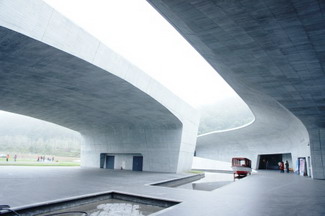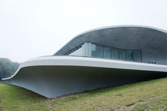 日月潭向山行政暨遊客中心,是由日本株式會社團紀彥建築設計事務所設計。基地剛好面對涵碧樓,樓高二層,避免過於凸出於山林之中,比較是平面性的配置,以不影響周遭整體環境為目標,相較水社碼頭上的超高建築,真是強烈的對比。建築上用了不少曲線,也用了著名清水模、無邊界水池來增加與日月潭的連結及呼應。
